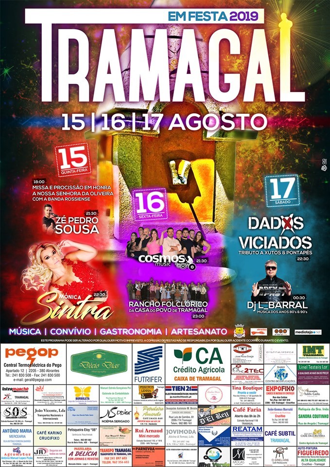 As festas de verão em Tramagal iniciam esta quinta-feira, dia 15 de agosto, com a artista Mónica Sintra como cabeça de cartaz. O dia feriado é também o momento da procissão em honra de Nossa Senhora da Oliveira, às 18:00, que será acompanhada pela Banda Rossiense.