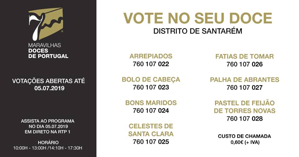 Esta sexta-feira, dia 5 de julho, ultimo dia para a votação da Palha de Abrantes, candidata às 7 maravilhas doces de Portugal, a RTP1 vai transmitir em direto a partir de Santarém, entre as 10:00 e as 17:30, onde será eleito o doce pré-finalista do distrito.