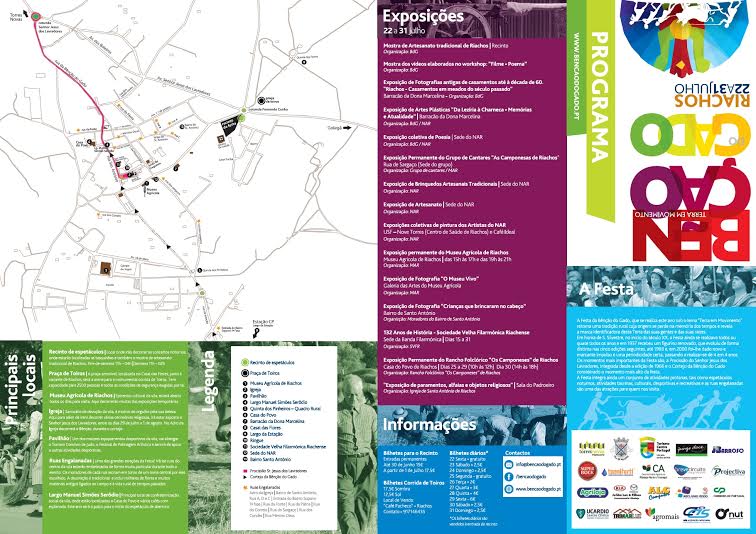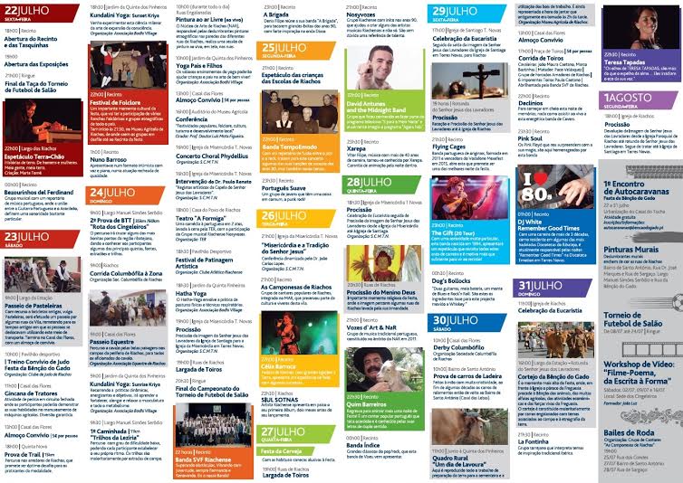 Mas o programa é muito mais extenso. Gincana de tratores, torneio de judo, passeio de pasteleiras, prova de trail, yoga, Festival de Folclore, corrida columbófila, caminhadas, teatro, patinagem artística, largada de toiros, exposição fotográfica, corrida de toiros, entre almoços de convívio e muito mais.