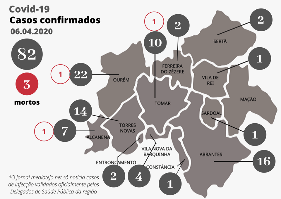 Ourém (22), Abrantes (16), Torres Novas (14) Tomar (10), Alcanena (7), Vila Nova da Barquinha (4), Ferreira do Zêzere (2), Entroncamento (2) Constância (1), e Sardoal (1), a par de três mortes (em Tomar (1), Alcanena (1) e Ourém (1), são os dados acumulados referentes ao ACES Médio Tejo ao dia de hoje [segunda-feira] e validados por Maria dos Anjos Esperança, Delegada de Saúde Pública.