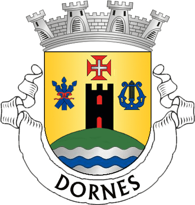 Descrição: Escudo de ouro, monte de verde encimado por torre de negro, lavrada de prata, aberta e iluminada de vermelho, entre três círios de azul, passados dois em aspa e um em pala, atados de vermelho e uma lira de azul; em chefe, cruz da Ordem de Cristo; campanha ondada de prata, carregada de uma burela ondada de azul. Coroa mural de prata de quatro torres. Listel branco com a legenda a negro em maiúsculas: “DORNES“.