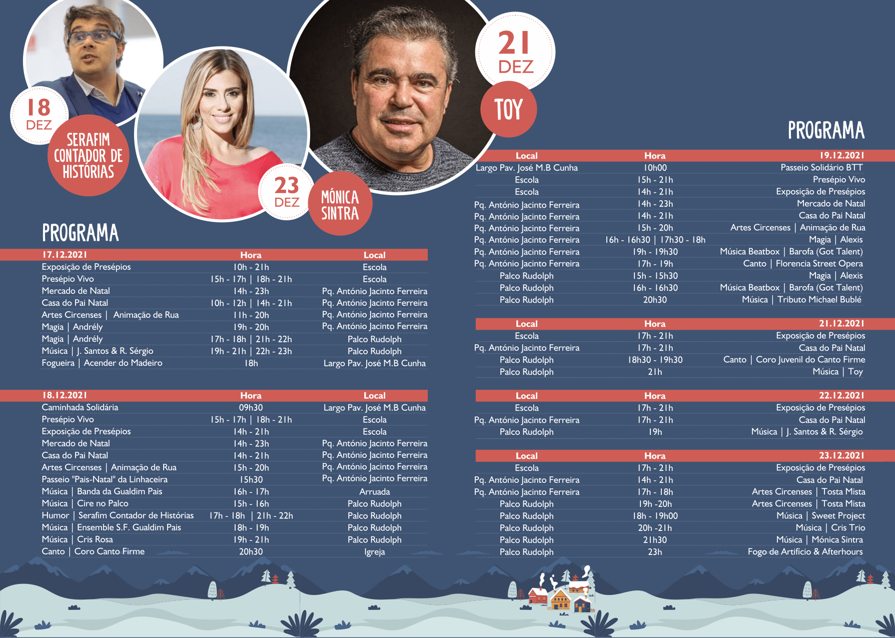 Para acrescentar uma pitada de felicidade, haverá lugar para o humor com muitas e engraçadas histórias contadas por Serafim. Para segurança de todos, e porque ainda vivemos numa pandemia, só é possível assistir aos espetáculos do principal – o Palco Rudolph – em lugares sentados e após apresentação de certificado digital por todos os maiores de 12 anos.