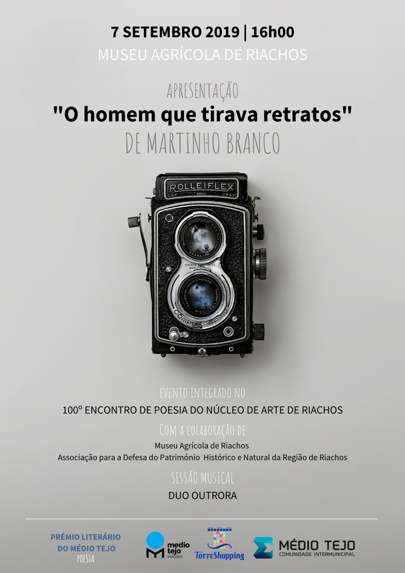 A apresentação de “O homem que tirava retratos”, lançado em junho deste ano na Feira do Livro de Lisboa pela Médio Tejo Edições / Origami Livros, integra-se no 100º Encontro de Poesia do Núcleo de Arte de Riachos, num evento com a colaboração do Museu Agrícola de Riachos e a Associação para a Defesa do Património Histórico e Natural da Região de Riachos. A sessão terá também música ao vivo, com o Duo Outrora (guitarra e bandolim).