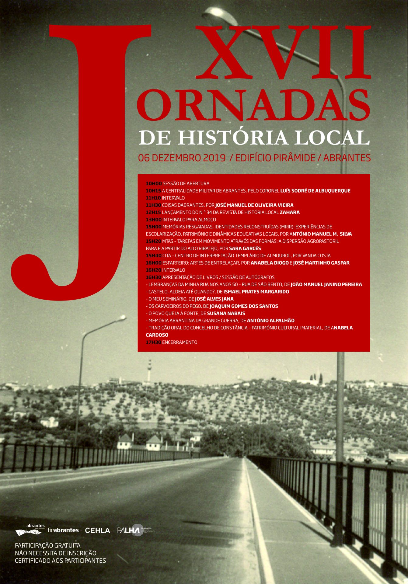 O Centro de Estudos de História Local de Abrantes (CEHLA) organiza esta sexta-feira, dia 6 de dezembro, no Edifício Pirâmide (Abrantes), as XVII Jornadas de História Local. O programa é vasto e decorre ao longo de todo o dia, sendo que a sessão de abertura está marcada para as 10:00.